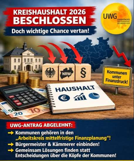 In der Sitzung des Kreistages am 23. März 2026 wurde der Haushalt für das Jahr 2026 verabschiedet. Die UWG-Fraktion hat [mehr...]